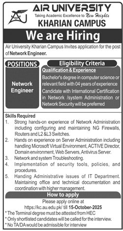 Air University Kharian Campus has officially announced Air University Career Opportunities in Kharian Campus October 2025 Advertisement Advertisement for the position of Network Engineer. This opportunity is ideal for experienced IT professionals who have strong expertise in network administration, system security, server management, and troubleshooting. The role offers a chance to work in a dynamic educational environment where candidates with international certifications in Network/System Administration or Network Security will be preferred. If you are passionate about IT infrastructure and want to contribute to the growth of a prestigious institution, this opening is worth applying for.