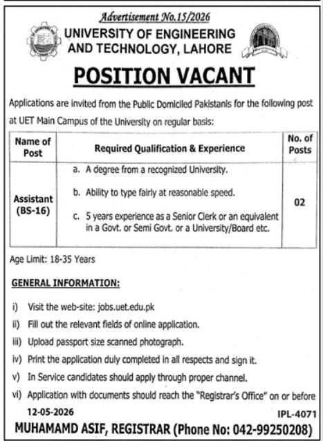 The Assistant Jobs in Lahore May 2026 Advertisement announced by the University of Engineering and Technology (UET) Lahore offers a great opportunity for candidates looking for a stable government position in the education sector. UET Lahore is inviting applications from Pakistani nationals for the post of Assistant (BS-16) on a regular basis at its Main Campus. Applicants must meet the required qualification of a university degree along with typing skills and 5 years of relevant clerical experience. This is a strong career opportunity for experienced administrative professionals seeking government employment with long-term growth and security.