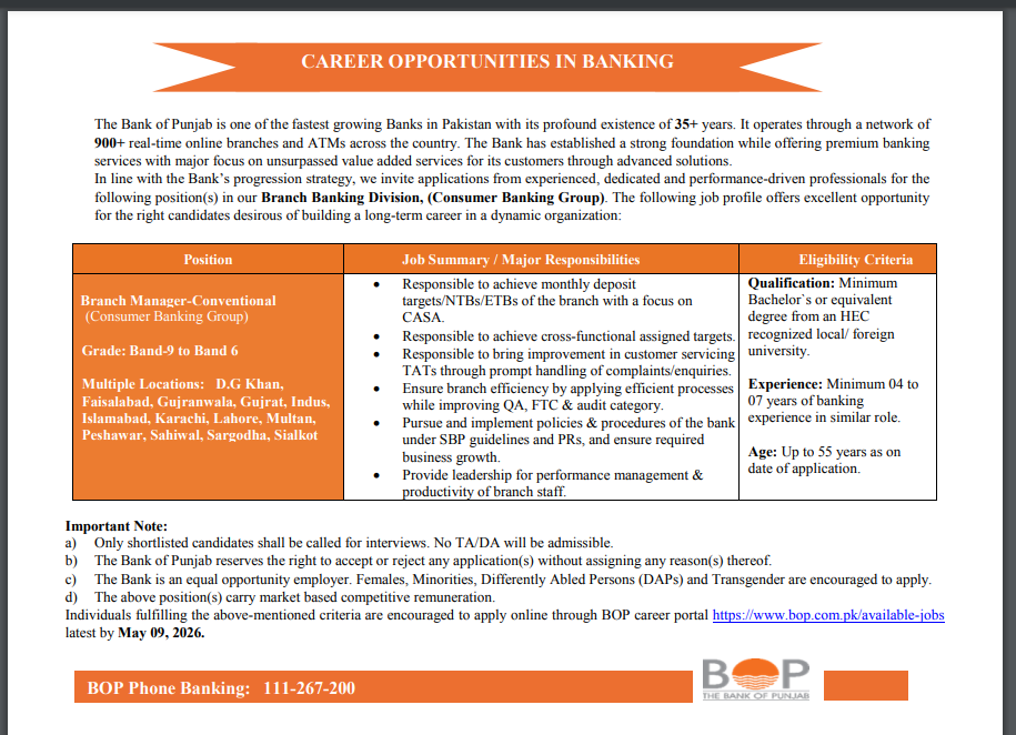 👉 https://www.bop.com.pk/available-jobs - Applications must be submitted before 09 May 2026.
