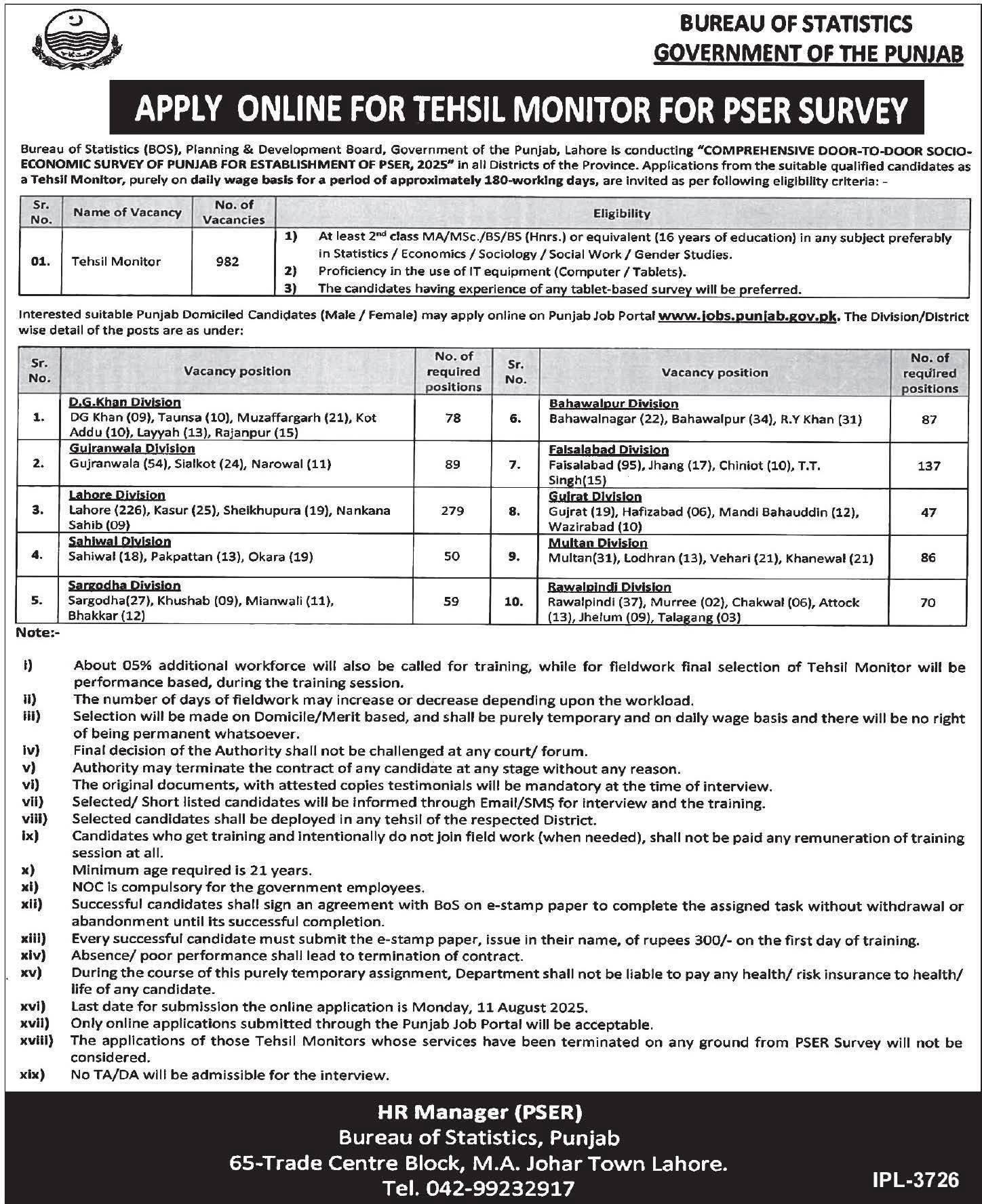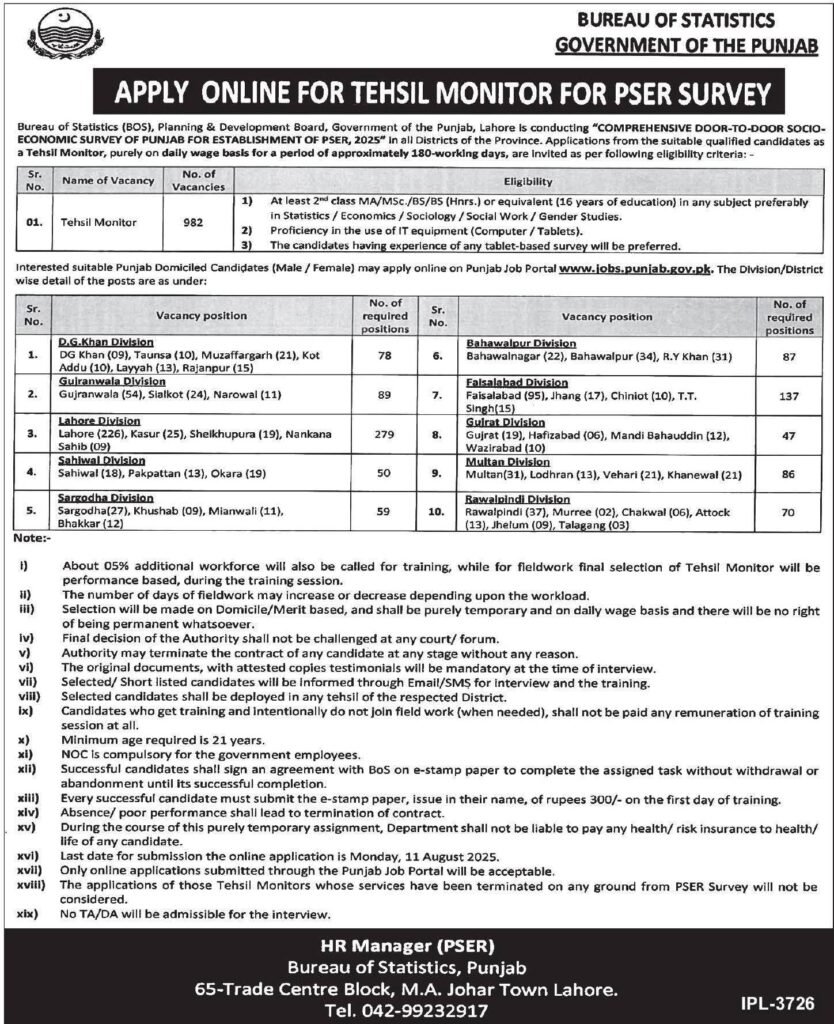 The Bureau of Statistics BOS Jobs in Punjab July 2025 Apply Online advertisement offers a great opportunity for educated and tech-savvy individuals across Punjab to participate in a major socio-economic initiative. The Bureau of Statistics (BOS), Planning & Development Board, Government of Punjab, is conducting a Comprehensive Door-to-Door Socio-Economic Survey (PSER 2025) and is hiring Tehsil Monitors purely on a daily wage basis for approximately 180 working days. The positions are open to both male and female Punjab domiciled candidates with at least 16 years of education. Candidates must apply online via the Punjab Job Portal before August 11, 2025.