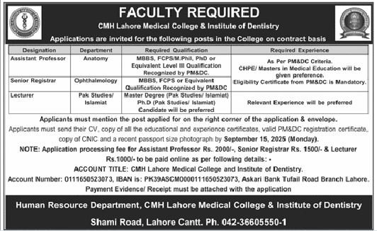 The latest Combined Military Hospital CMH Jobs in Lahore September 2025 Advertisement has been announced at CMH Lahore Medical College & Institute of Dentistry. The college is seeking applications from highly qualified and motivated individuals for the positions of Assistant Professor, Senior Registrar, and Lecturer in various departments. These roles are offered on a contract basis with attractive career growth opportunities. Applicants with relevant PM&DC-recognized qualifications, teaching experience, and additional certifications will be preferred.