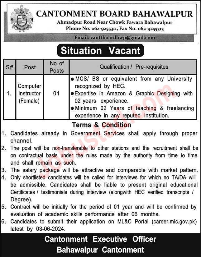 Computer Instructor Jobs in Cantonment Board Bahawalpur May 2024 Advertisement