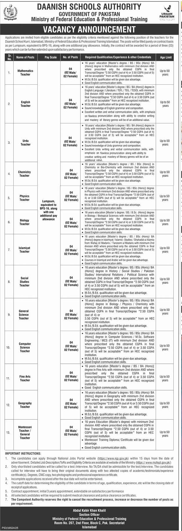 The Daanish School Authority Jobs February 2026 Advertisement has been officially announced by the Government of Pakistan under the Ministry of Federal Education & Professional Training. Applications are invited from qualified, competent, and passionate male and female teachers for Daanish School Kurri, Islamabad. These teaching positions are offered on a contract basis (lumpsum pay equivalent to BPS-16 with one additional pay allowance) under the URAAN Pakistan initiative. Initially, appointments will be made for three (03) years, extendable further based on satisfactory performance. This is an excellent opportunity for educators seeking a stable, well-reputed teaching career in a federal government institution with competitive benefits and professional growth.