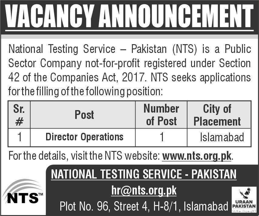 Director Operations Required at Islamabad October 2025 Good News for Jobs Seekers VACANCY ANNOUNCEMENT National Testing Service – Pakistan (NTS) is a Public Sector Company not-for-profit registered under Section 42 of the Companies Act, 2017. NTS seeks applications for the filling of the following position Director Operations.In these Latest Govt Jobs in Islamabad male and Female candidate are eligible to Apply.