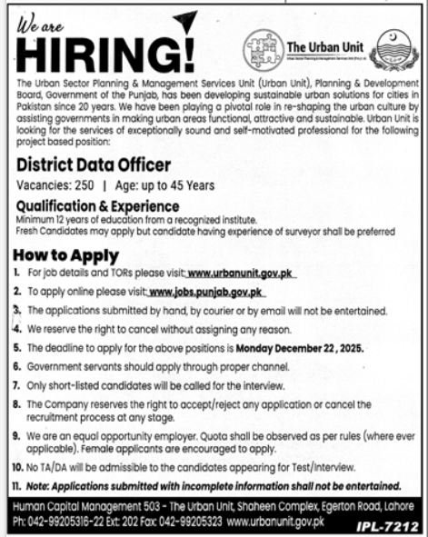The District Data Officer Vacancies In Punjab December 2025 Advertisement announces a massive recruitment drive by The Urban Unit, Government of Punjab, offering 250 project-based positions for motivated, skilled, and fresh candidates across the province. As a leading organization working for sustainable urban development for over 20 years, The Urban Unit is seeking dedicated individuals capable of supporting district-level data operations. With a simple eligibility requirement and equal opportunities for all, this recruitment provides an excellent chance for candidates to join a prestigious government-led urban development initiative. Interested applicants can apply online before 22 December 2025 through the Punjab Jobs Portal.