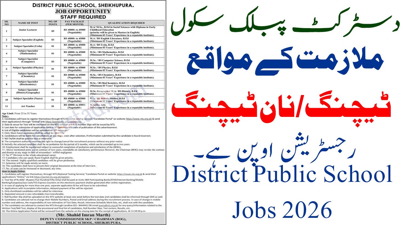 The District Public School Jobs in Sheikhupura February 2026 Advertisement has been officially announced by District Public School Sheikhupura under the supervision of the Board of Governors (BOG). Applications are invited from qualified, experienced, and motivated candidates for multiple teaching positions on a contract basis. The school is seeking dynamic educators with strong academic backgrounds, minimum three years of experience in reputable institutions, and a passion for quality education. All selections will be made strictly on merit through National Testing Service (NTS). Attractive monthly salary packages ranging from Rs. 40,000 to Rs. 45,000 (negotiable) are being offered.