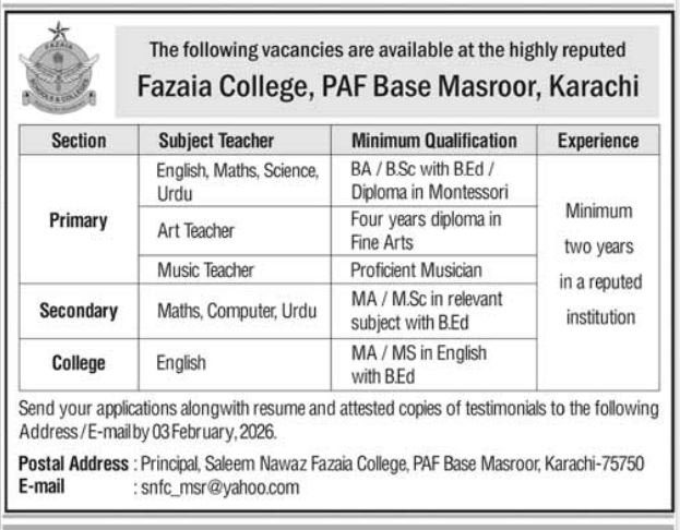 Fazaia College PAF Base Jobs in Karachi January 2026 Advertisement has been officially announced by the highly reputed Saleem Nawaz Fazaia College, PAF Base Masroor, Karachi. Applications are invited from qualified, motivated, and experienced education professionals for teaching positions at Primary, Secondary, and College levels. This is an excellent opportunity for teachers who wish to work in a disciplined, well-structured, and prestigious educational environment under the Pakistan Air Force setup. Candidates with strong academic backgrounds, relevant professional qualifications, and teaching experience in reputed institutions are encouraged to apply before the due date.