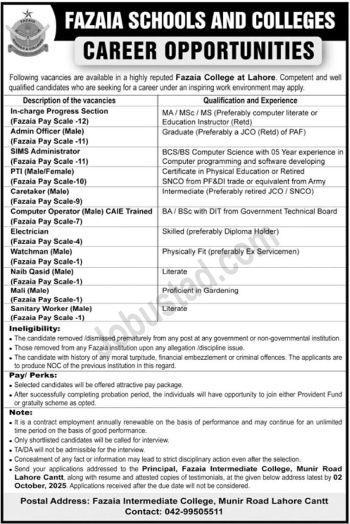 The Fazaia Schools and Colleges have announced multiple career opportunities under the Fazaia Schools and College PAF Vacancies Open in Lahore September 2025 Advertisement. These vacancies are available at a highly reputed Fazaia College in Lahore, offering an inspiring work environment, attractive pay packages, and long-term career growth. Both teaching and non-teaching staff positions are open, ranging from administrative roles to support staff. Retired armed forces personnel are especially encouraged to apply for several posts.