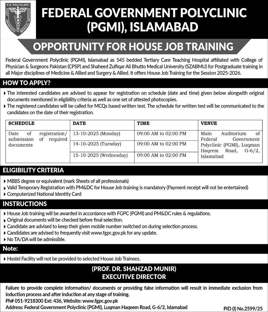 The Federal Government Polyclinic (PGMI), Islamabad a 545-bedded tertiary care teaching hospital affiliated with CPSP and SZABMU—has announced opportunities for House Job Training (Session 2025–2026). This is an excellent chance for fresh MBBS graduates to gain hands-on training in major disciplines of Medicine & Allied and Surgery & Allied under experienced supervision. The program offers structured learning in accordance with FGPC (PGMI) and PM&DC rules, ensuring professional growth in a reputed institution.
