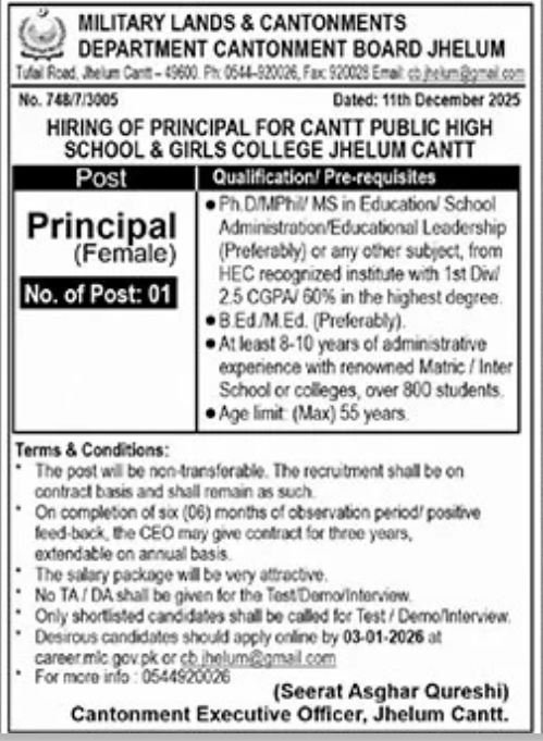 The Female Principal Required at Jhelum Cantt January 2026 Advertisement has been officially announced by the Military Lands & Cantonments Department, Cantonment Board Jhelum. Applications are invited from highly qualified, experienced, and dynamic female education leaders for the post of Principal at Cantt Public High School & Girls College Jhelum Cantt. This opportunity is ideal for senior academicians with strong administrative backgrounds who are passionate about leading large educational institutions. The position is offered on a contract basis, with an attractive salary package and the possibility of extension based on performance after a successful observation period.