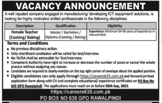 A well-reputed ICT manufacturing & solutions company is hiring experienced, motivated Female Teachers (Cooking/Baking) in Rawalpindi — Female Teachers Jobs in Rawalpindi August 2025 Advertisement. If you have a qualification in cooking/baking and 4–6 years’ hands-on experience, this is an opportunity to join a professional team that values skill, discipline and practical teaching ability. Apply online and send your printed application with supporting documents by post — the company welcomes committed women who want a stable, respectful workplace.