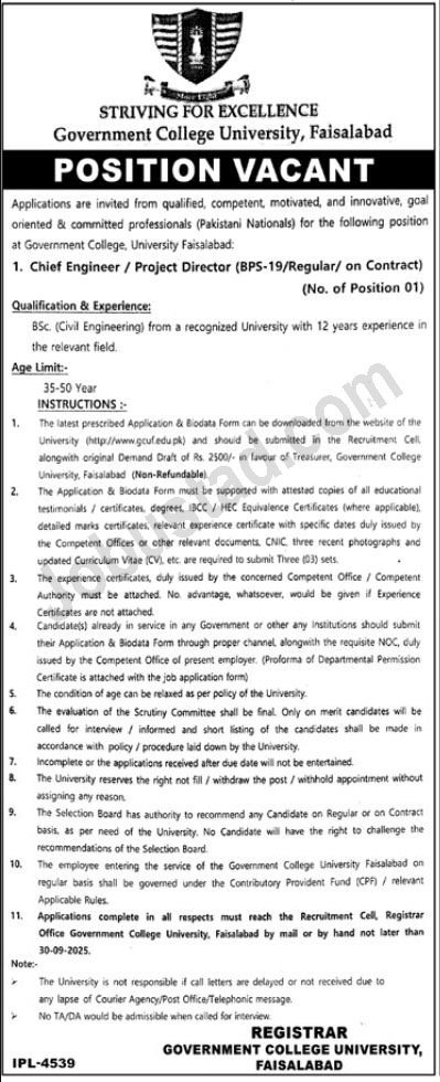 The Govt College University Faisalabad GCUF Jobs September 2025 Advertisement has been announced, inviting applications from qualified, competent, and motivated professionals for the position of Chief Engineer / Project Director (BPS-19). This is an excellent opportunity for experienced civil engineers to join one of the top universities in Pakistan. The position is offered on a regular/contract basis and comes with attractive benefits and career stability. Candidates with the required qualifications and relevant experience are encouraged to apply before the closing date.