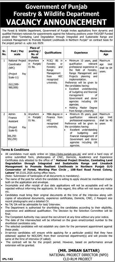 The Govt of Punjab Forestry & Wildlife Department Vacancy Announcement January 2026 Advertisement brings an excellent career opportunity for experienced and qualified Pakistani professionals to work on an internationally funded development initiative. The Forest & Wildlife Department, Government of Punjab, is hiring on a contract basis under the FAO/GEF funded project titled “Combating Land Degradation through Integrated and Sustainable Range and Livestock Management to Promote Resilient Livelihoods in Northern Punjab”. These positions offer attractive project pay scales, professional exposure with donor agencies, and the chance to contribute to sustainable environmental and livelihood development in Punjab, with contracts valid up to July 2029 and extendable annually based on performance.