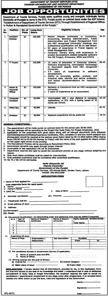 The Government of the Punjab – Department of Tourist Services (DTS) has announced multiple contract-based job opportunities for qualified and energetic individuals under the ADP Scheme “Establishment of DTS Through Establishment of Regional Offices in Multan & Rawalpindi.” Candidates with Punjab domicile can apply for positions ranging from Assistant Director to supporting staff. The advertisement highlights educational qualifications, age limits, experience requirements, salary packages, and the complete application submission process. If you are seeking Govt of Punjab Tourism Department Jobs November 2025, this is an excellent opportunity to join the tourism sector under an attractive project-based pay package.