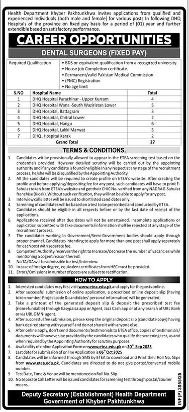 The Health Department Jobs in KPK September 2025 Advertisement has been announced, inviting applications from qualified and experienced individuals (both male and female) for Dental Surgeon positions at multiple District Headquarters (DHQ) Hospitals across Khyber Pakhtunkhwa. These appointments will be on a fixed pay basis for one year, extendable based on satisfactory performance. Candidates with BDS or equivalent qualification, valid PMC registration, and house job completion are encouraged to apply. Recruitment will be conducted through ETEA, ensuring a transparent and merit-based process.