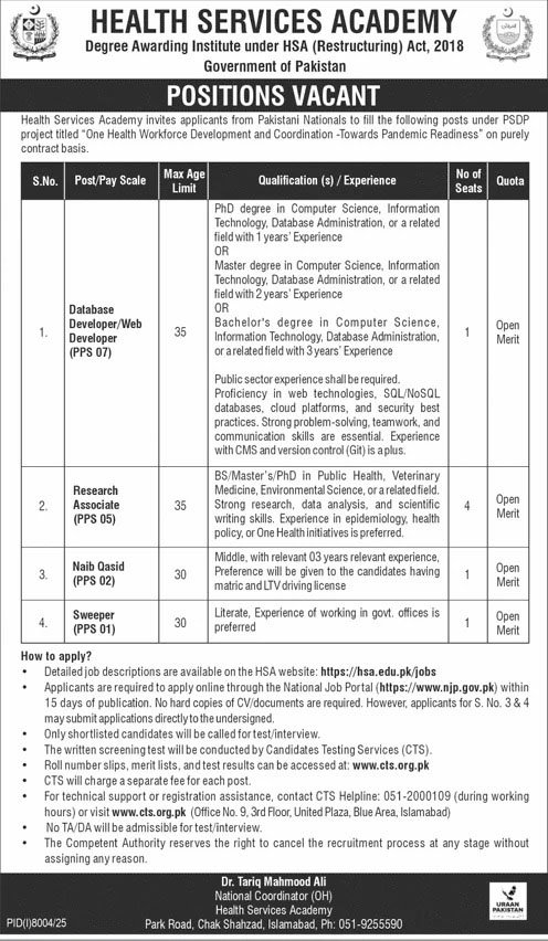 The Health Services Academy (HSA), a degree-awarding institute under the Government of Pakistan, has announced multiple contract-based vacancies under the PSDP project titled “One Health Workforce Development and Coordination – Towards Pandemic Readiness.” These positions are open to qualified Pakistani nationals in technical, research, and support roles. Candidates with expertise in IT, public health, and relevant fields are encouraged to apply through the National Job Portal within the given deadline. This is an excellent opportunity to contribute to national health preparedness initiatives. Don’t miss out—explore the Health Services Academy Jobs in Islamabad April 2026 Advertisement and apply on time.