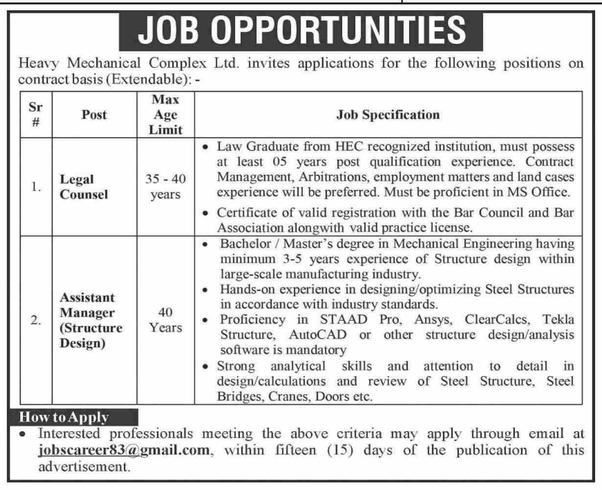The Heavy Mechanical Complex HMC Jobs September 2025 Advertisement has been announced, offering excellent career opportunities for talented professionals on a contract basis (extendable). Applications are invited for the positions of Legal Counsel and Assistant Manager (Structure Design). Candidates with strong qualifications, relevant experience, and technical expertise are encouraged to apply within 15 days of the advertisement. This is a great chance to join one of Pakistan’s leading heavy engineering organizations.
