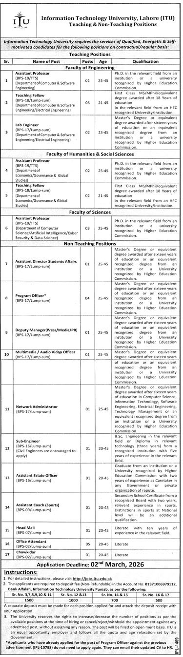 The Information Technology University (ITU), Lahore has announced a wide range of Teaching and Non-Teaching job opportunities for qualified, energetic, and self-motivated candidates. These vacancies are offered on contractual and regular bases across multiple faculties including Engineering, Sciences, Humanities & Social Sciences, and administrative departments. This Information Technology University Jobs in Lahore February 2026 Advertisement is an excellent opportunity for professionals seeking a reputable career in academia or university administration with competitive BPS/TTS and lump-sum packages in Punjab’s leading public sector IT university.