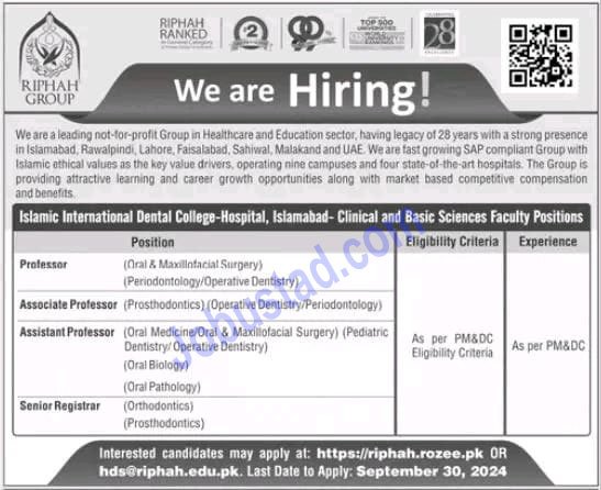 - Interested candidates may apply at: https://riphah.rozee.pk OR hds@riphah.edu.pk.