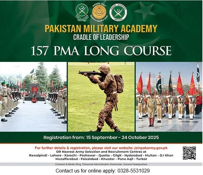 The Pakistan Military Academy (PMA) Kakul, the cradle of leadership since 1947, has announced that registration for 157 PMA Long Course in 2025 is now open. Young, passionate, and determined individuals aspiring to serve the nation as commissioned officers in the Pakistan Army can now apply. The registration process will run from 15th September to 24th October 2025. Eligible candidates can register online at joinpakarmy.gov.pk or visit their nearest Army Selection and Recruitment Centre (AS&RC).