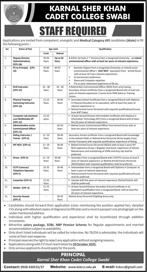 Applications must reach the Principal, Karnal Sher Khan Cadet College, Swabi before 20 October 2025.