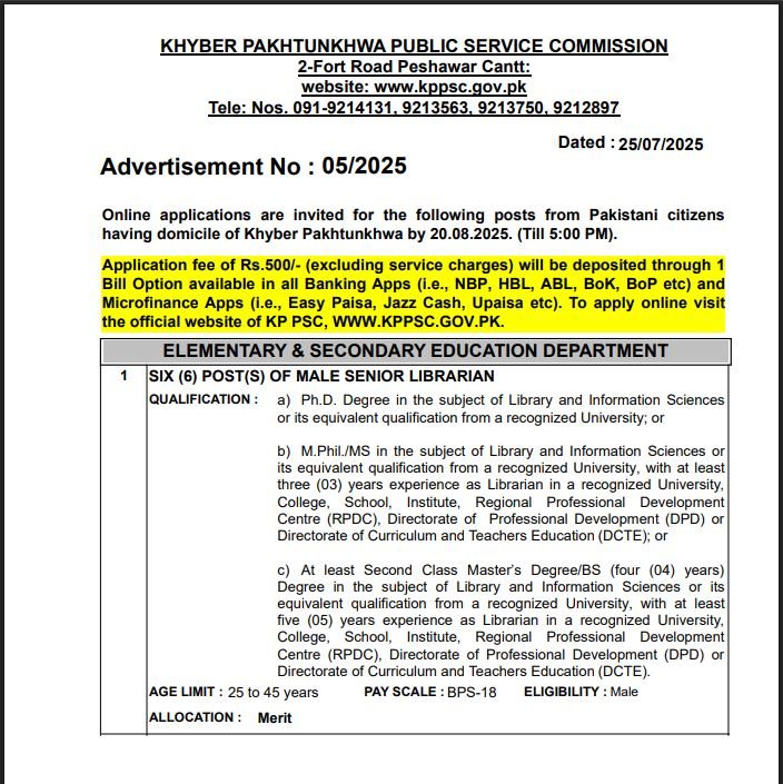 Khyber Pakhtunkhwa Public Service Commission KPPSC Jobs Advertisement 05/2025 The Khyber Pakhtunkhwa Public Service Commission (KPPSC) invites online applications from Pakistani citizens having domicile of Khyber Pakhtunkhwa for various posts. The last date for submission of applications is 20 August 2025 (till 5:00 PM). Applicants are required to deposit an application fee of Rs.500/- (excluding service charges) through the 1 Bill Option available in all banking apps such as NBP, HBL, ABL, BoK, BoP, etc., as well as microfinance apps including Easy Paisa, Jazz Cash, and Upaisa. To apply online, candidates must visit the official KPPSC website at www.kppsc.gov.pk and complete the application process before the deadline.