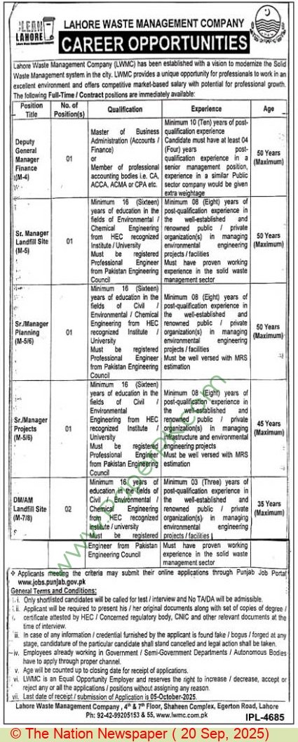 The latest Lahore Waste Management Company Jobs October 2025 Advertisement has been announced, offering excellent opportunities for experienced professionals in finance, environmental engineering, chemical engineering, and project management. LWMC, established to modernize solid waste management in Lahore, provides a competitive market-based salary, professional growth prospects, and a dynamic work environment. Candidates with strong leadership skills and relevant public/private sector experience are encouraged to apply for senior management and technical positions before the deadline