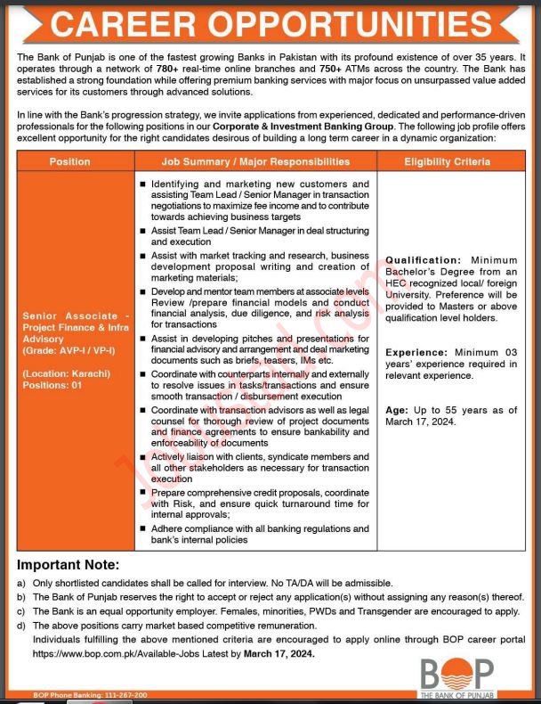 - Individuals fulfilling the above mentioned criteria are encouraged to apply online through BOP career portal https://www.bop.com.pk/Available-Jobs Latest by March 17, 2024.