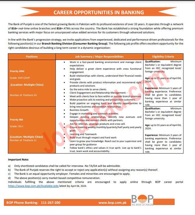 • Individuals fulfilling the above mentioned criteria are encouraged to apply online through BOP career portal https://www.bop.com.pk/Available-jobs latest by April 04, 2024.