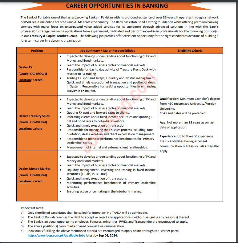 - Individuals fulfilling the above mentioned criteria are encouraged to apply online through BOP career portal http://www.bop.com.pk/available-jobs latest by Sep 06, 2024.