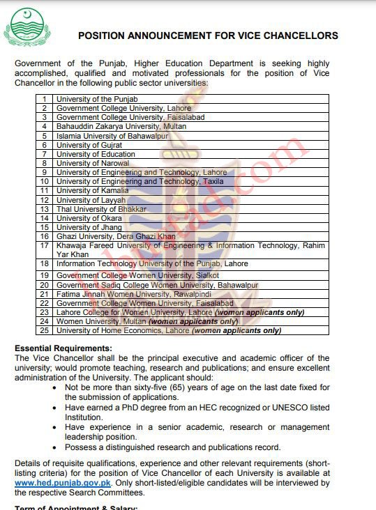 - Details of requisite qualifications, experience and other relevant requirements (shortlisting criteria) for the position of Vice Chancellor of each University is available at www.hed.punjab.gov.pk.