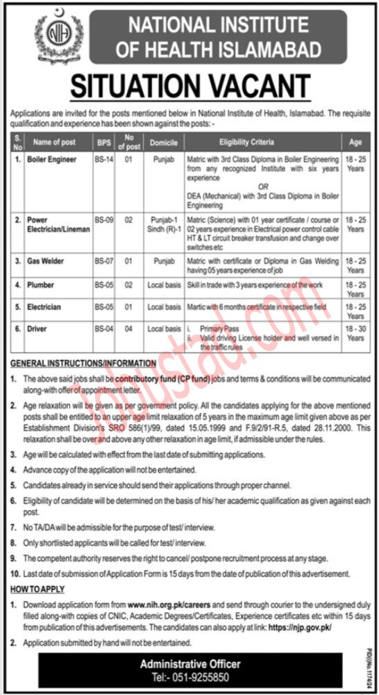 Latest National Institute of Health Jobs in Islamabad August 2024 Advertisement