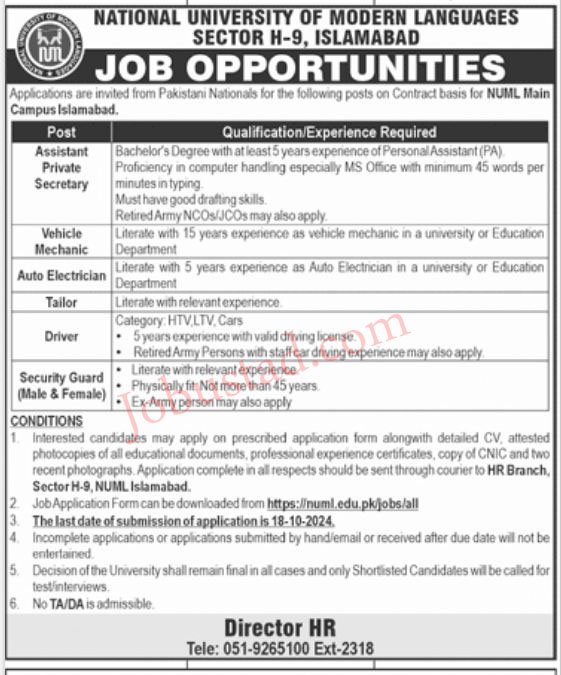 Latest NUML Jobs in Islamabad October 2024 Advertisement