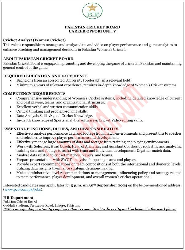 Latest Pakistan Cricket Board PCB Jobs Opportunities in Lahore September 2024 has been announce through latest advertisement Applications are Inviting from suitable candidates whose meet up the Criteria to full these Cricket Analyst Post Details are Mention Below.In these Latest Govt Jobs in Punjab both Male and Female candidates can Apply in these Jobs and can get these New Jobs in Pakistan 2024 after Completion of Jobs Procedure.