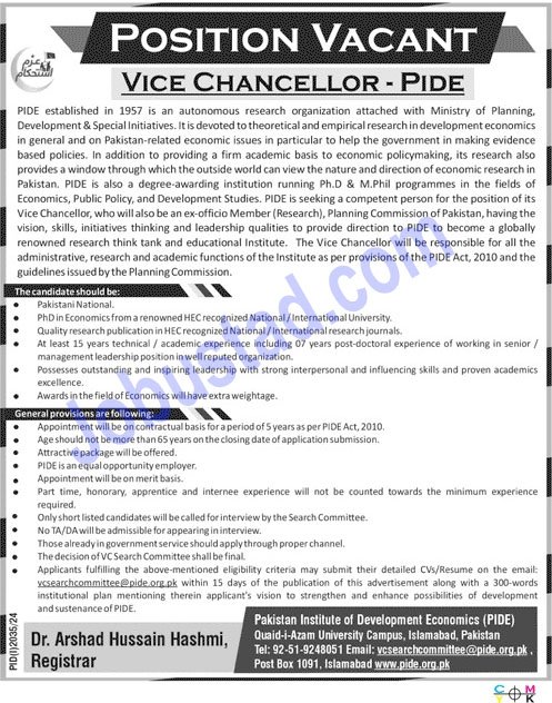 - Applicants fulfilling the above-mentioned eligibility criteria may submit their detailed CVs/Resume on the email: ycsearchcommittee@pide.org.pk within 15 days of the publication of this advertisement along with a 300-words institutional plan mentioning therein applicant’s vision to strengthen and enhance possibilities of development and sustenance of PIDE.
