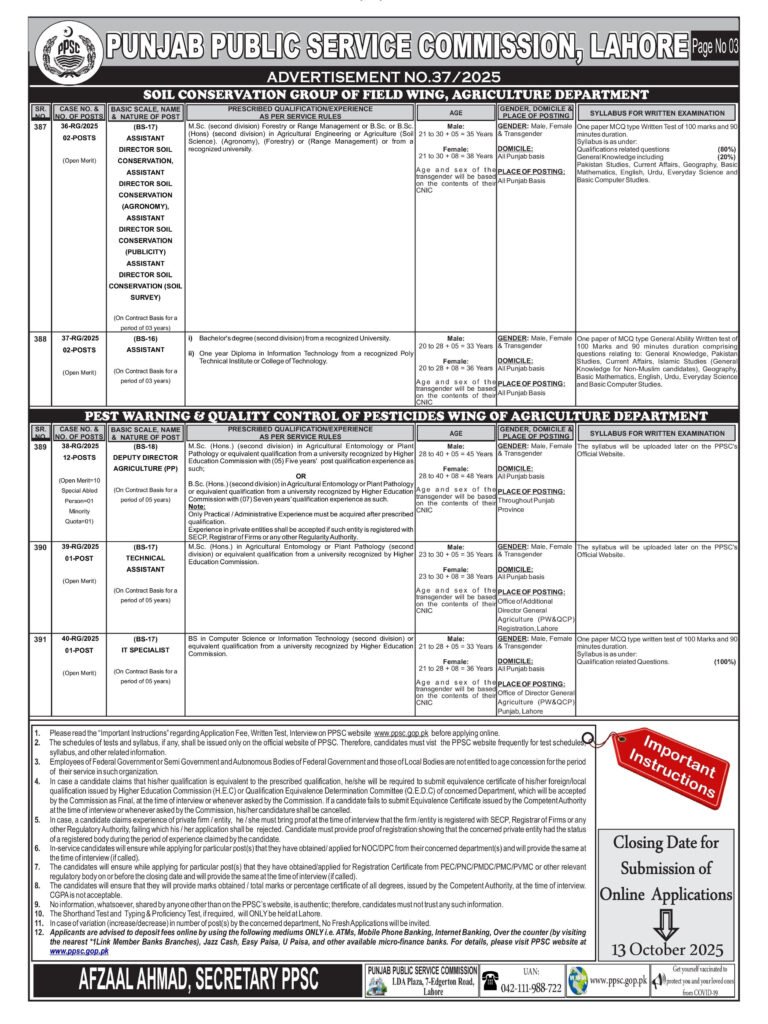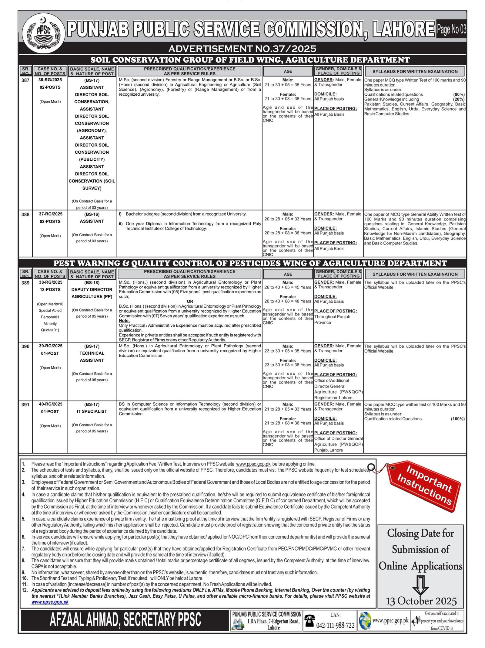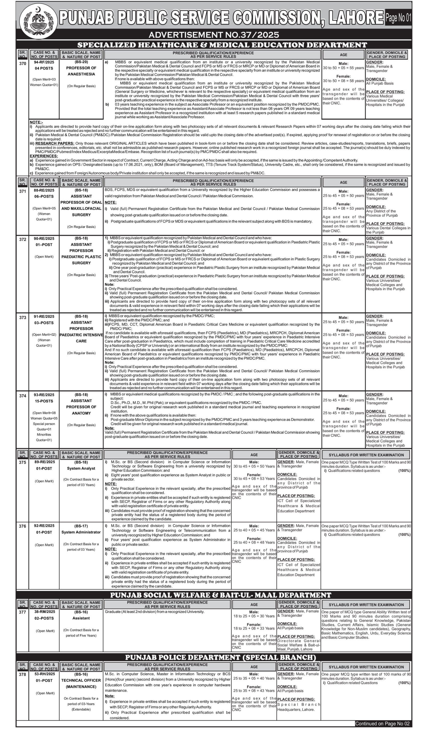 Latest PPSC Jobs Advertisement 37/2025 Advertisement No. 37 2025 issued by Punjab Public Service Commission.Which is the latest advertisement of 2025 from PPSC.According to this advertisement, vacancies have been announced in various departments of Punjab.In which the Specialized Healthcare and Medical Education Department,Punjab Police Department,Agriculture Department Punjab,Information and Culture Department,Punjab Social Welfare and Baitul Mal Department,Various types of jobs have been announced in etc.Both male and female candidates can apply for the post of Open in Punjab.The last date to apply for the award is October 13, 2025.