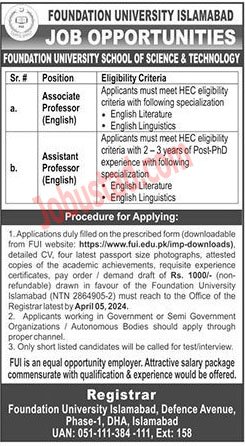 - Applications duly filed on the prescribed form (downloadable from FUI website: https://www.fui.edu.pk/imp-downloads). detailed CV. four latest passport size photographs, attested copies of the academic achievements, requisite experience certificates, pay order / demand draft of Rs. 1000/– (non- refundable) drawn in favour of the Foundation University Islamabad (NTN 2864905-2) must reach to the Office of the Registrar latest by April 05, 2024.