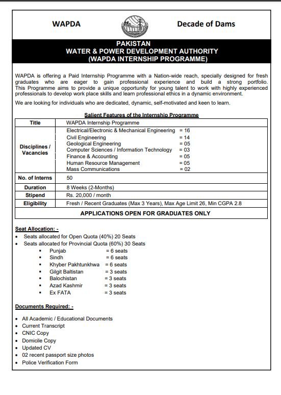 The Latest Wapda Internships Program March 2026 Advertisement has been announced by the Water and Power Development Authority (WAPDA) under the Decade of Dams initiative in Pakistan. This paid internship program is specially designed for fresh and recent graduates who want to gain professional experience and develop workplace skills while working with experienced professionals. The internship provides an excellent opportunity to build a strong professional portfolio and understand organizational ethics in a dynamic environment. WAPDA is looking for dedicated, dynamic, and self-motivated graduates from multiple disciplines including engineering, IT, finance, HR, and mass communication. Selected interns will receive a monthly stipend of Rs. 20,000 for a two-month internship period, and applications must be submitted online before 29 March 2026 through the official WAPDA website.