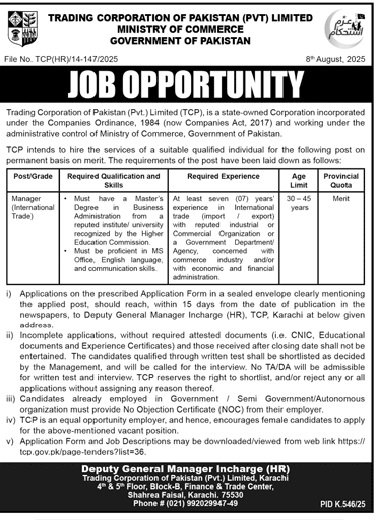 The Trading Corporation of Pakistan (Pvt.) Limited (TCP), operating under the Ministry of Commerce, Government of Pakistan, has announced a permanent vacancy for the position of Manager (International Trade) in August 2025. This is a merit-based opportunity for highly qualified and experienced individuals to join a state-owned organization engaged in global trade. The role offers an excellent platform for professionals with expertise in import/export, commercial operations, and international business administration to work with a prestigious government corporation.