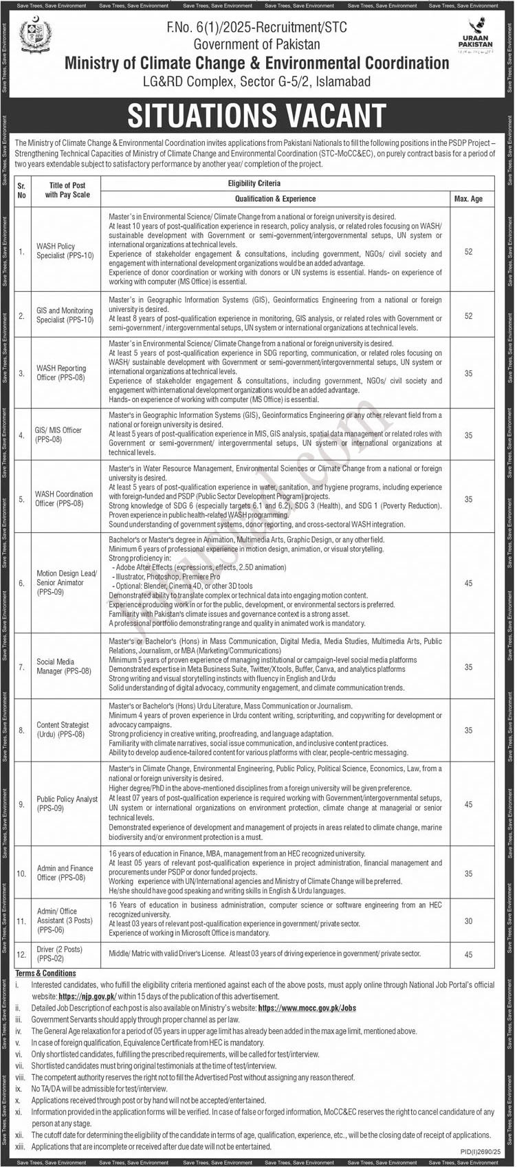 The Government of Pakistan has announced Ministry of Climate Change MOCC Vacancies Open in Pakistan September 2025 Apply Online under the PSDP Project Strengthening Technical Capacities of Ministry of Climate Change and Environmental Coordination (STC-MoCC&EC). These positions are purely on a contract basis for two years (extendable subject to performance or project completion). Pakistani nationals with relevant qualifications and experience are invited to apply for multiple posts including WASH Specialists, GIS Experts, Social Media Managers, Content Strategists, and more. The last date to apply is within 15 days of advertisement publication through the National Job Portal (NJP).