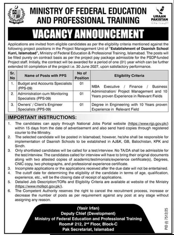 The Ministry of Federal Education and Professional Training Jobs in Pakistan March 2026 Advertisement invites applications from qualified and experienced candidates for project-based positions under the Establishment of Daanish School Kurri, Islamabad project. These vacancies are offered on a contract basis through the Project Management Unit (PMU) funded by PSDP. The initial contract will be for one year, extendable until 30 June 2027 based on satisfactory performance. Interested professionals in finance, administration, project management, and engineering are encouraged to apply through the National Jobs Portal and submit required documents before the closing date.