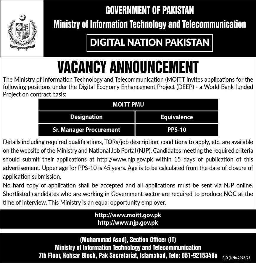 The Government of Pakistan, Ministry of Information Technology and Telecommunication (MOITT), has announced a new career opportunity under the Digital Economy Enhancement Project (DEEP) — a World Bank-funded initiative focused on driving Pakistan’s digital transformation. This Ministry of Information Technology and Telecommunication Vacancy Announcement October 2025 Apply Online invites highly qualified and motivated professionals to apply for the post of Sr. Manager Procurement (PPS-10) on a contract basis. The role offers a chance to contribute to national-level digital development and modernization. Interested candidates can apply online through the National Job Portal (NJP) within 15 days of publication of this advertisement.