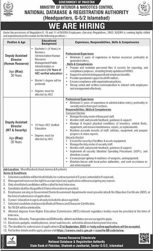 The Ministry of Interior Jobs in Pakistan September 2025 Advertisement has been announced by the National Database & Registration Authority (NADRA). Applications are invited from talented and motivated professionals for the positions of Deputy Assistant Director (Human Resource) and Deputy Assistant Director (MT & Security). These roles are based at NADRA’s headquarters in Islamabad with specific postings in Muzaffarabad, AJK. Candidates with strong academic qualifications, at least 2 years of relevant professional experience, and skills in HR management, administration, transport, and security are encouraged to apply. The positions are on a 5-year contractual basis (extendable) with competitive benefits and equal opportunity for all, including women, minorities, differently-abled individuals, and transgender persons.
