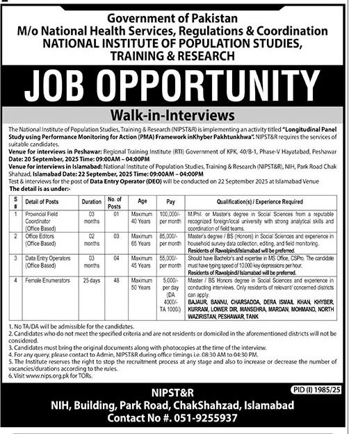 The Ministry of National Health Services Regulations and Coordination (MNHSRC) Jobs September 2025 have been announced through the National Institute of Population Studies, Training & Research (NIPST&R). Walk-in-interviews are being held in Peshawar and Islamabad for multiple project-based positions under the “Longitudinal Panel Study using PMA Framework in Khyber Pakhtunkhwa.” The available roles include Provincial Field Coordinator, Office Editors, Data Entry Operators, and Female Enumerators. Candidates with qualifications in Social Sciences, MS Office, and survey experience are encouraged to apply. These positions offer attractive salary packages and short-term contracts with allowances for enumerators.