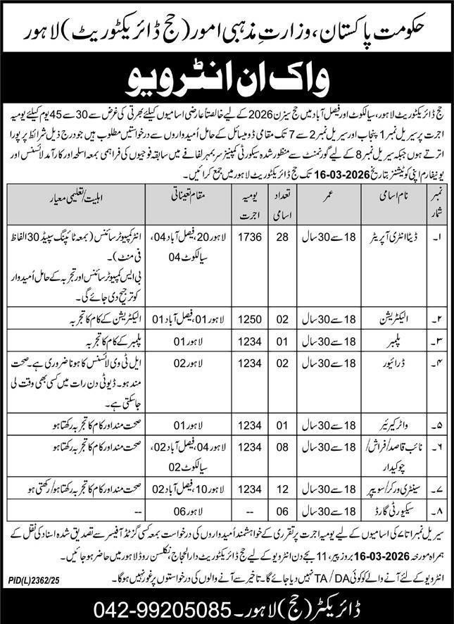 Ministry of Religious Affairs Vacancies February 2026 Advertisement has been announced by the Ministry of Religious Affairs and Interfaith Harmony, Government of Pakistan, through the Hajj Directorate Lahore. Applications are invited for purely temporary / daily-wage jobs for the Hajj Season 2026 in Lahore, Faisalabad, and Sialkot. These appointments are for 30 to 45 days only and will be made through walk-in interviews. This is a short-term opportunity for hardworking individuals to serve during the Hajj operational period under a federal government department.