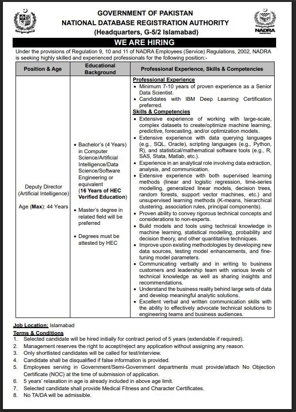 The National Database & Registration Authority (NADRA) is hiring a senior technical professional — Nadra Announce Careers Opportunities in Islamabad August 2025 Apply Online — for the role of Deputy Director (Artificial Intelligence). If you are an experienced data scientist/AI professional with a strong academic background (HEC-attested) and 7–10 years’ proven experience building large-scale ML/AI solutions, this contract role (Islamabad) offers a five-year opportunity to lead applied AI work, translate data into business impact, and work with senior leadership — apply online before 31 August 2025.