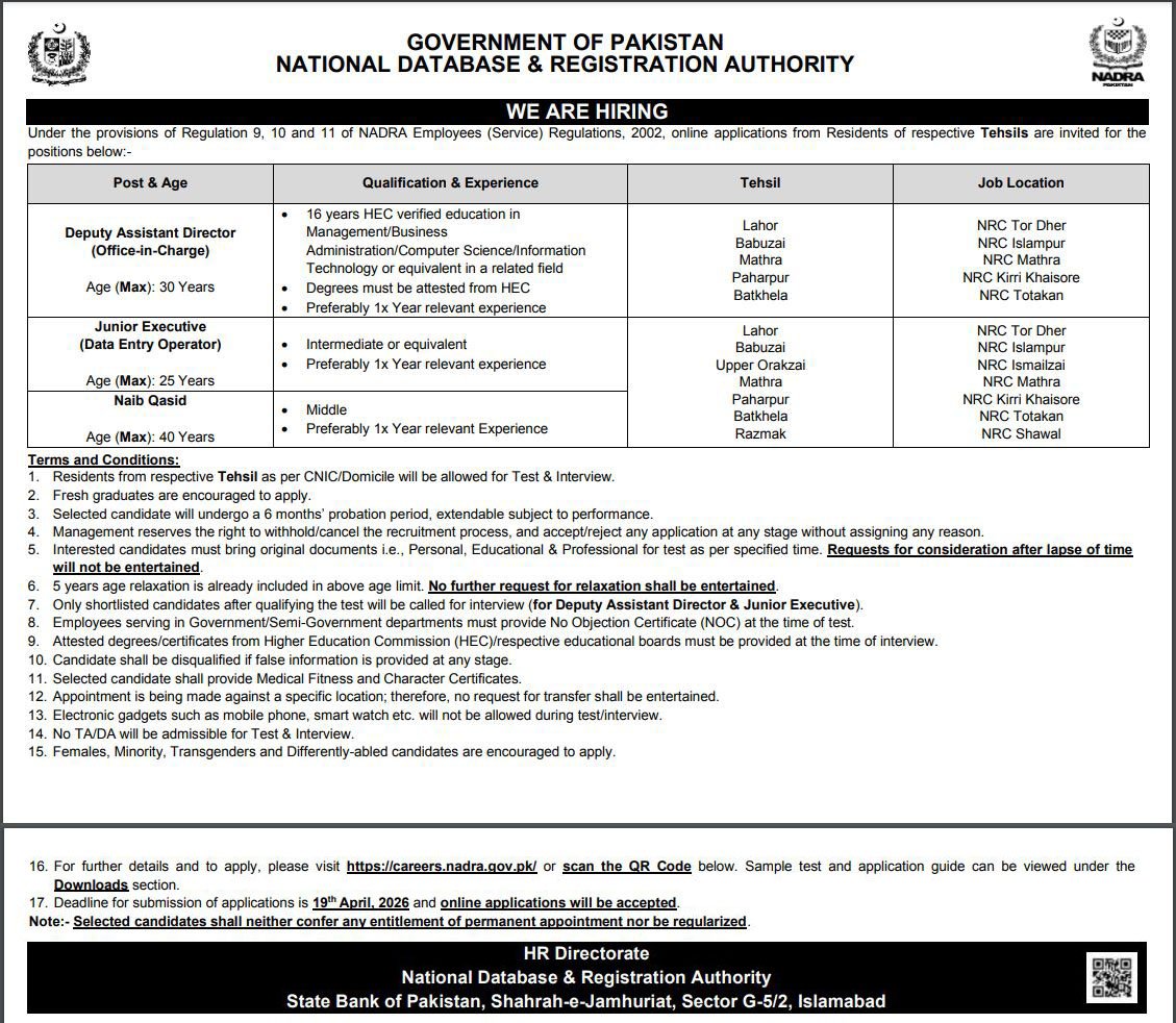 NADRA Jobs 2026 has been announced through the advertisement and and looking Interested, Dynamic , Experience, Brilliant Candidate to Full fill these Positions with a Handsome salary Package and Allowance According to Department Policies. In these Latest Jobs in NADRA the eligible Male/Female candidates from across the country can apply through the procedure defined by the organization and can get these Today Jobs in Pakistan 2026 after the complete recruitment process.