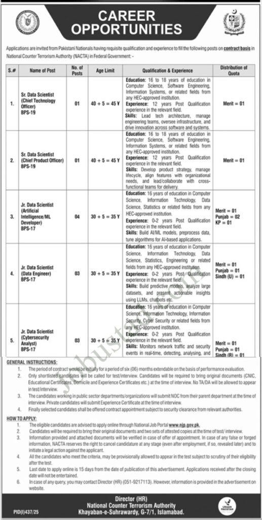 Are you a tech-savvy professional ready to contribute to national security and innovation? The National Counter Terrorism Authority (NACTA) is inviting applications from talented individuals across Pakistan for multiple contract-based roles in the fields of data science, artificial intelligence, cybersecurity, and software engineering. If you’re passionate about leveraging technology to make a difference, these National Counter Terrorism Authority NACTA Jobs in Pakistan July 2025 offer a unique opportunity to work with the federal government in shaping digital defense strategies.