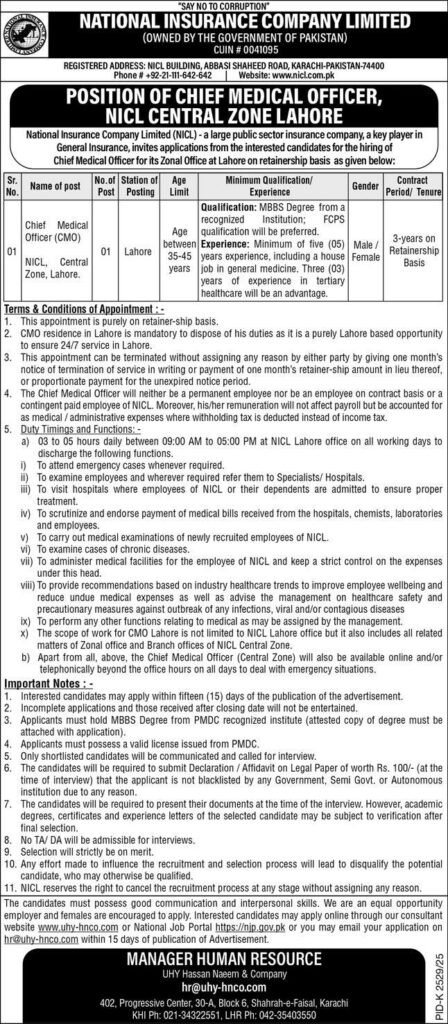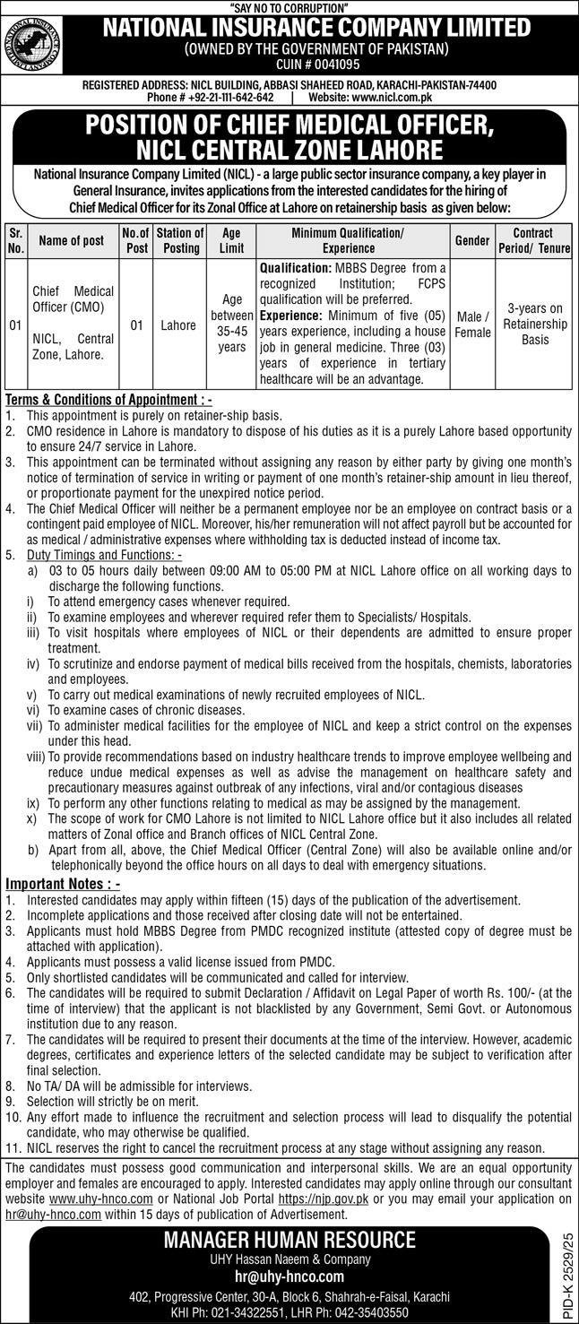 National Insurance Company Jobs in Pakistan January 2026 Advertisement has been officially announced by National Insurance Company Limited (NICL), a prestigious public sector organization owned by the Government of Pakistan. NICL is inviting applications from qualified, experienced, and dedicated medical professionals for the position of Chief Medical Officer (CMO) at its Central Zone Office, Lahore, on a retainership basis. This opportunity is ideal for MBBS-qualified doctors with relevant clinical and tertiary healthcare experience who are looking to serve in a reputable government-owned organization while contributing to employee healthcare management, wellbeing initiatives, and cost control through professional medical oversight.