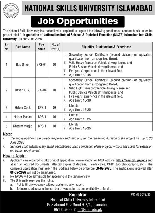 The National Skills University Jobs in Islamabad January 2026 Apply Online advertisement has been officially announced by National Skills University (NSU), Islamabad. Applications are invited from eligible Pakistani candidates for multiple contract-based support staff positions under the development project “Up-gradation of National Institute of Science & Technical Education (NISTE) Islamabad into Skills University.” These jobs are purely temporary and will remain valid up to 30 June 2026. This opportunity is ideal for individuals seeking government-sector experience in Islamabad with basic education and relevant skills. Interested candidates must apply through the prescribed application form available on the NSU website within the given deadline.
